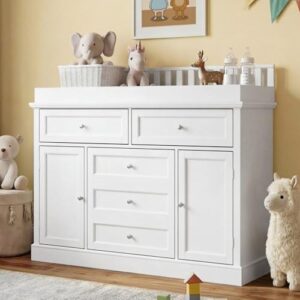 Crafted from sustainable New Zealand pine wood with a soft Pebble Gray finish, this piece balances nursery aesthetics with lasting durability. The GREENGUARD Gold certification ensures low chemical emissions, creating a healthier breathing environment for infants. Integrated Euro drawer glides deliver smooth, quiet operation, while the sturdy engineered wood reinforcement keeps the frame stable through years of daily use. The attached changing station and generous storage compartments centralize diaper changes, wipes, and linens in one tidy hub, eliminating midnight trips to distant dressers. This design suits first-time parents and compact nurseries where maximizing floor space without sacrificing style matters most. The straightforward conversion path extends the furniture lifespan well into the tween years.